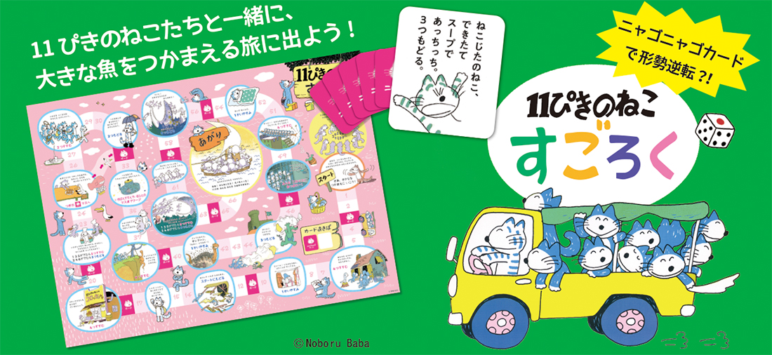 ロングセラー絵本「11ぴきのねこ」シリーズの世界がすごろくになりました。 シリーズ全6冊のエピソードが盛り込まれた、ハラハラドキドキの大冒険。最初に「たぬきのおなか」になれるねこは誰かな? 72.8x100.4cmの大きな盤面とコマ11個、サイコロ1個、ニャゴニャゴカード16枚入り。少人数でも大人数でも楽しく遊べます。