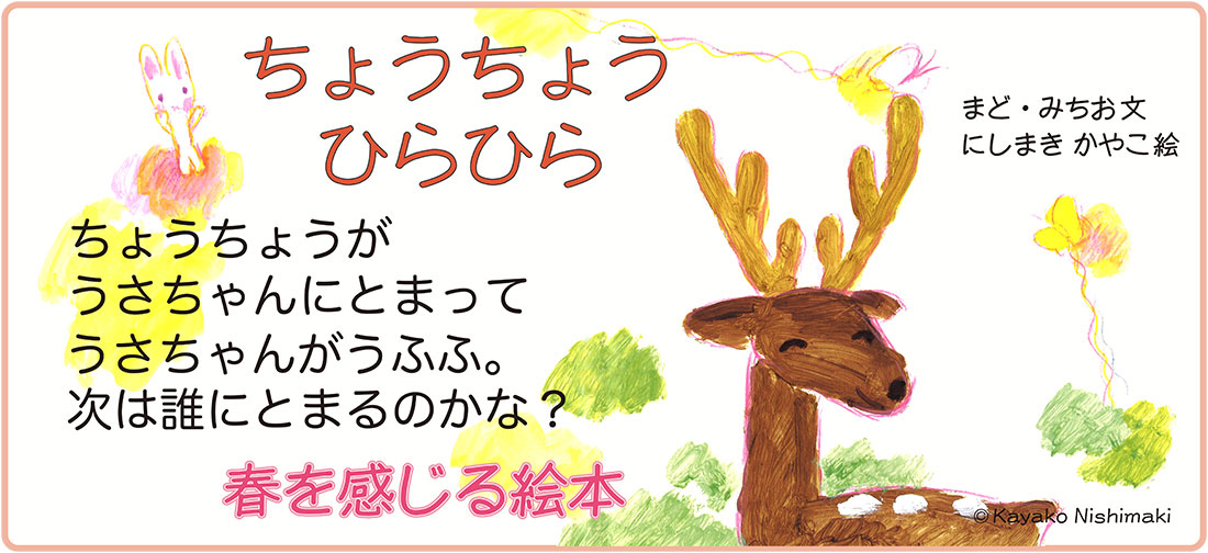 ちょうちょうひらひら、うさちゃんにとまった。うさちゃんがうふふ。シカさんにとまって、シカさんがえへへ。次は誰にとまるのかな?軽やかに飛ぶちょうちょうのように子どもの心を明るく楽しくしてくれる絵本。
