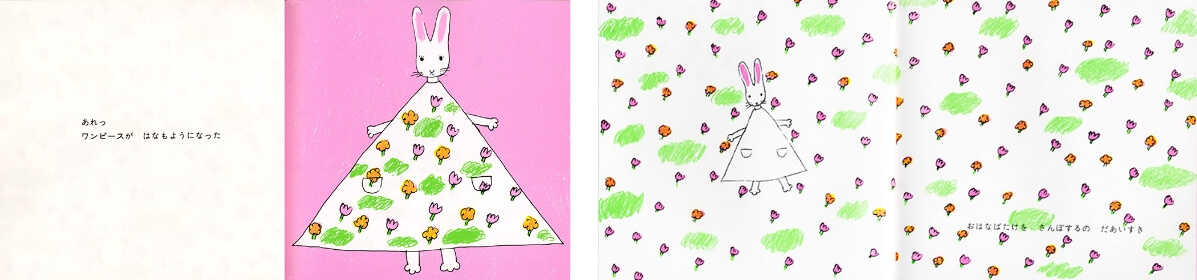 子どもたちは、「ページをめくるとこうなる」とわかっていても、いえ、わかっているからこそ、“予想と的中”というおもしろさを飽きるほどくり返し楽しみます。やがて、その全体がひとつのお話としてつながっていることもわかって、自然にお話の絵本の楽しみへと導かれていきます。うさぎさんのワンピースの柄が散歩をするうちに次々変わってゆく『わたしのワンピース』も、男女を問わず、この頃の子どもたちが大好きな絵本です。