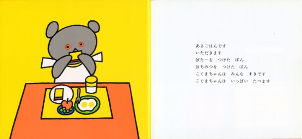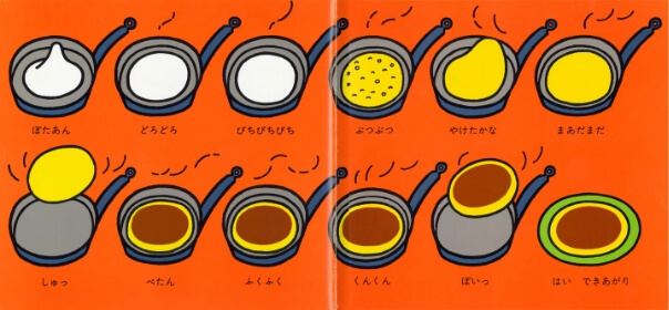 『こぐまちゃんえほん』シリーズで一番人気があるのがしろくまちゃんとお母さんがホットケーキ作りをする『しろくまちゃんのほっとけーき』。なかでも子どもたちをひきつけているのが、フライパンがずらっと並んだホットケーキが焼ける場面です。「ぽたあん どろどろ ぴちぴちぴち ぷつぷつ…」というページを飽きるほど眺め、音を楽しみ、その音によって、想像してにおいまで楽しむというほど、子どもにとっては魅力的なようです。絵と同じくらい、耳からのおもしろさにも子どもはひきつけられるのです。