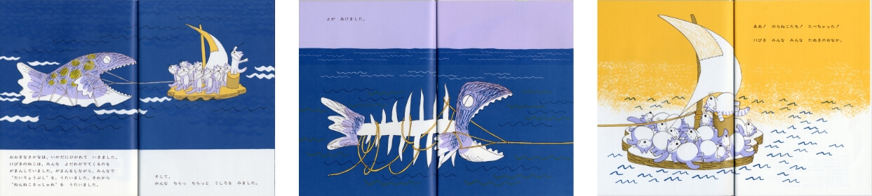 たとえば、『11ぴきのねこ』の最後の方に、大きな魚を捕まえたねこたちが「みんなに見せるまでは絶対食べないこと!」という約束をして、いかだで獲物の魚を引っぱっていくシーンがあります。やがて夜は更け、湖上が真っ暗闇になったあと、ページをめくると、“骨だけになった魚”の絵。文はただ、「よが あけました。」しかありません。そして最後のページでは、満腹でタヌキのお腹になったねこたちが…。おそらく、この展開を文章で表したとしたら、とてもまどろっこしいことになっていたでしょう。絵本でこそ生きるお話、絵本でしか表現できない痛快な展開です。